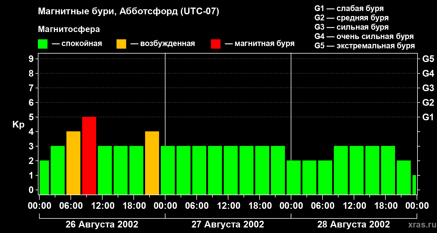 Изменения геомагнитного индекса Kp с 26 по 28 августа 2002 года для средних широт