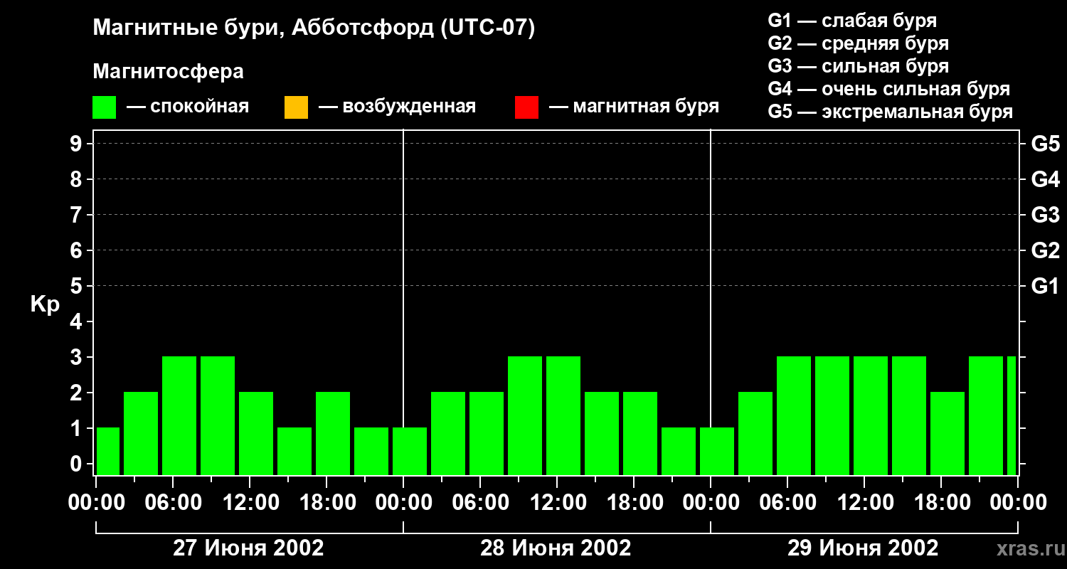 Изменения геомагнитного индекса Kp с 27 по 29 июня 2002 года для средних широт