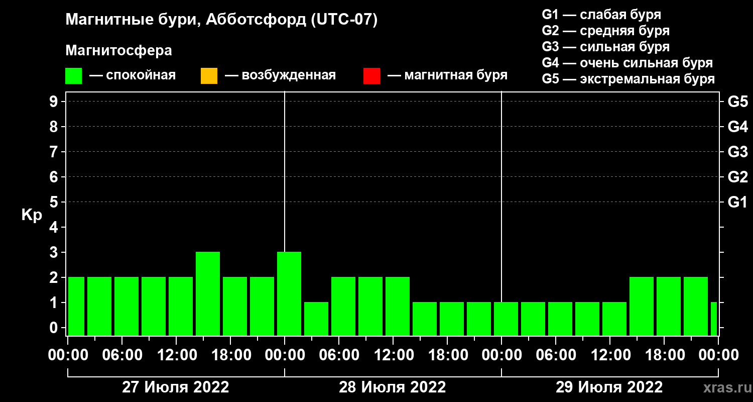 Изменения геомагнитного индекса Kp с 27 по 29 июля 2022 года для средних широт