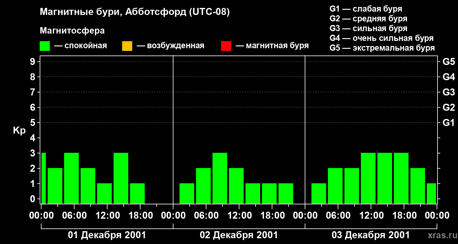 Изменения геомагнитного индекса Kp с 1 по 3 декабря 2001 года для средних широт