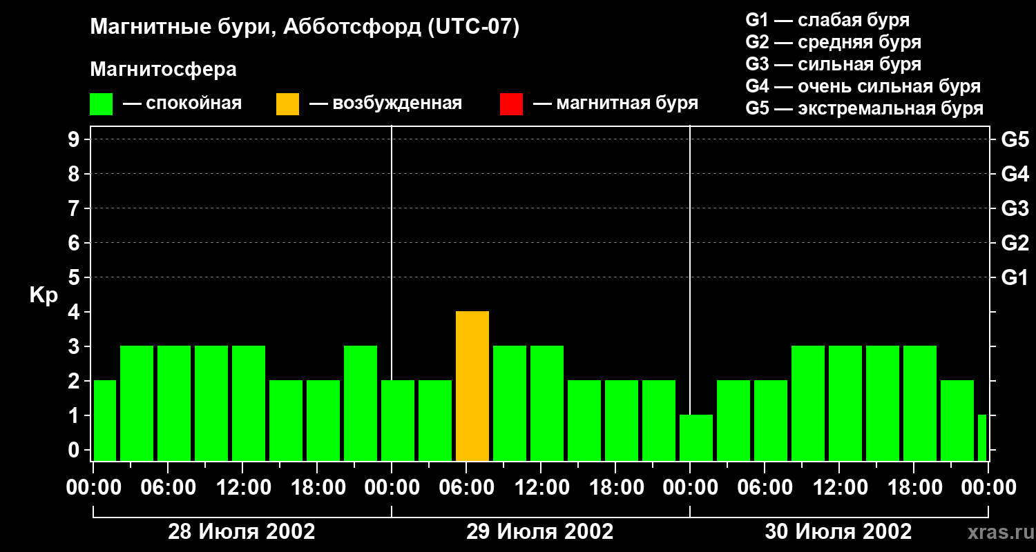 Изменения геомагнитного индекса Kp с 28 по 30 июля 2002 года для средних широт