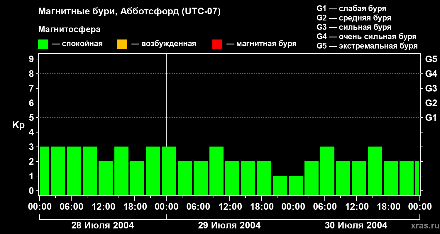 Изменения геомагнитного индекса Kp с 28 по 30 июля 2004 года для средних широт