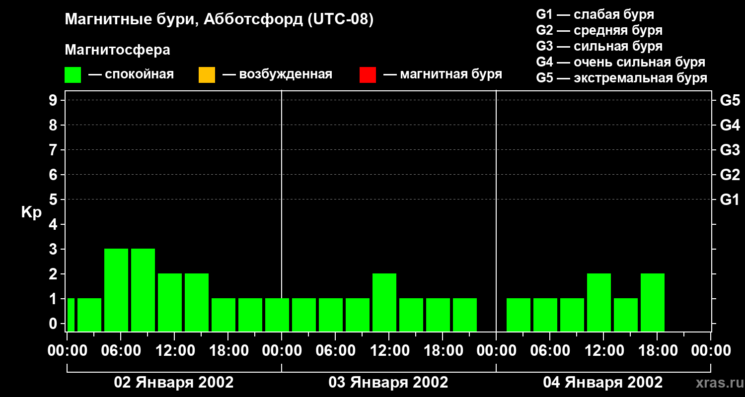 Изменения геомагнитного индекса Kp с 2 по 4 января 2002 года для средних широт