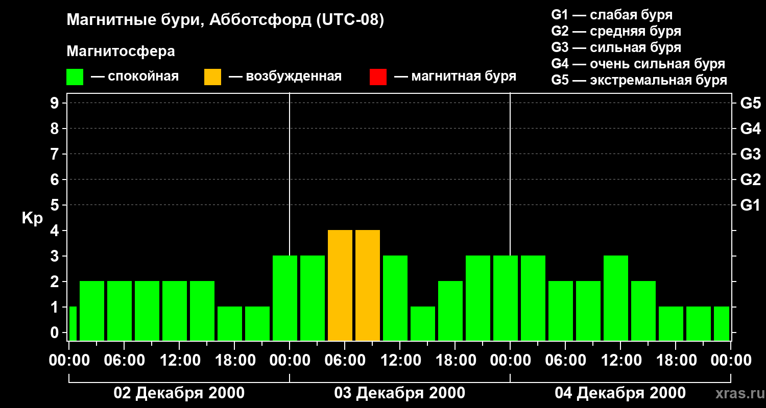 Изменения геомагнитного индекса Kp с 2 по 4 декабря 2000 года для средних широт