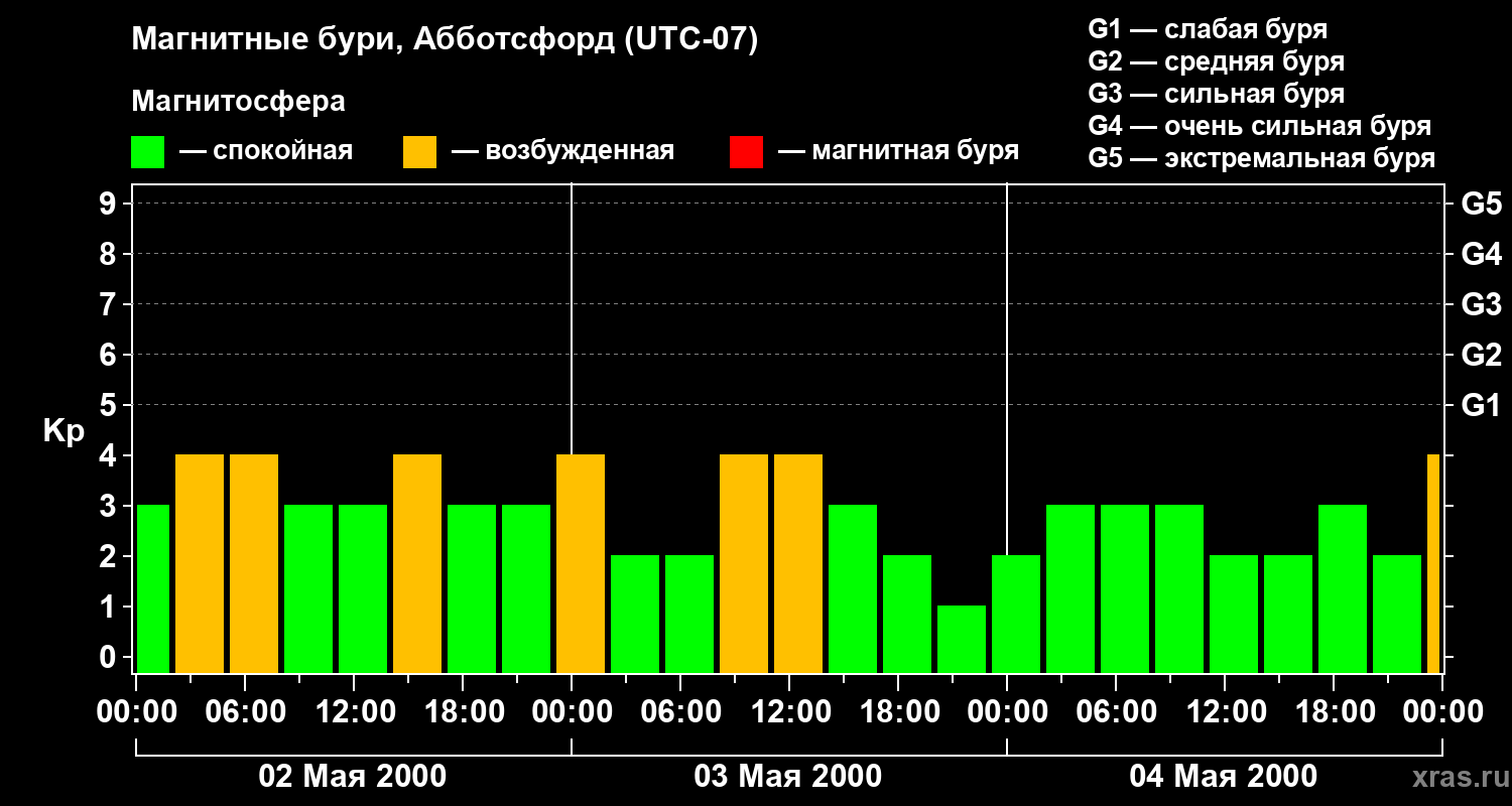 Изменения геомагнитного индекса Kp с 2 по 4 мая 2000 года для средних широт
