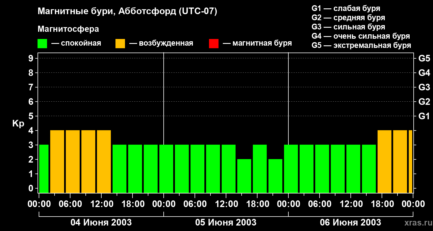 Изменения геомагнитного индекса Kp с 4 по 6 июня 2003 года для средних широт
