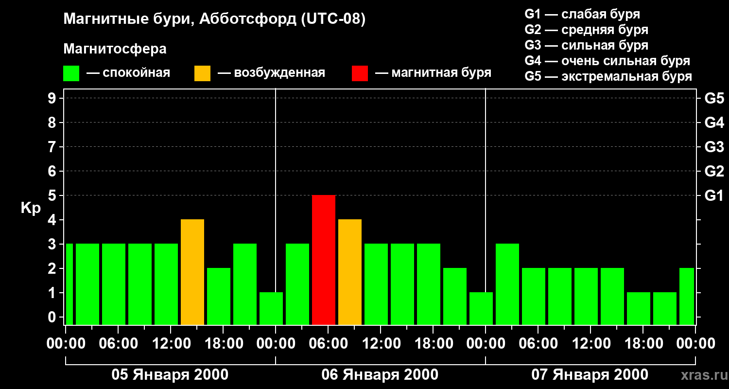 Изменения геомагнитного индекса Kp с 5 по 7 января 2000 года для средних широт
