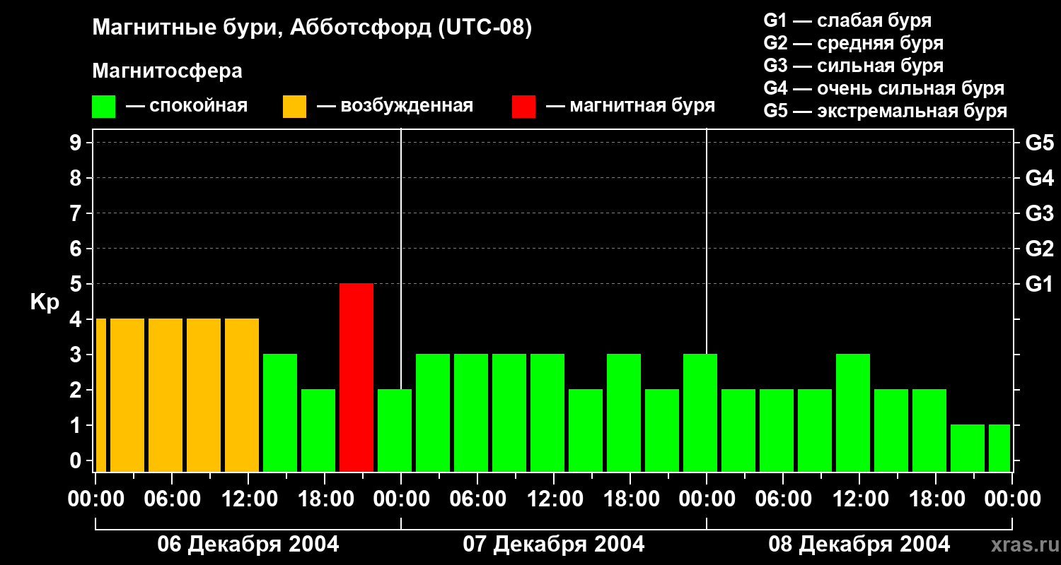 Изменения геомагнитного индекса Kp с 6 по 8 декабря 2004 года для средних широт