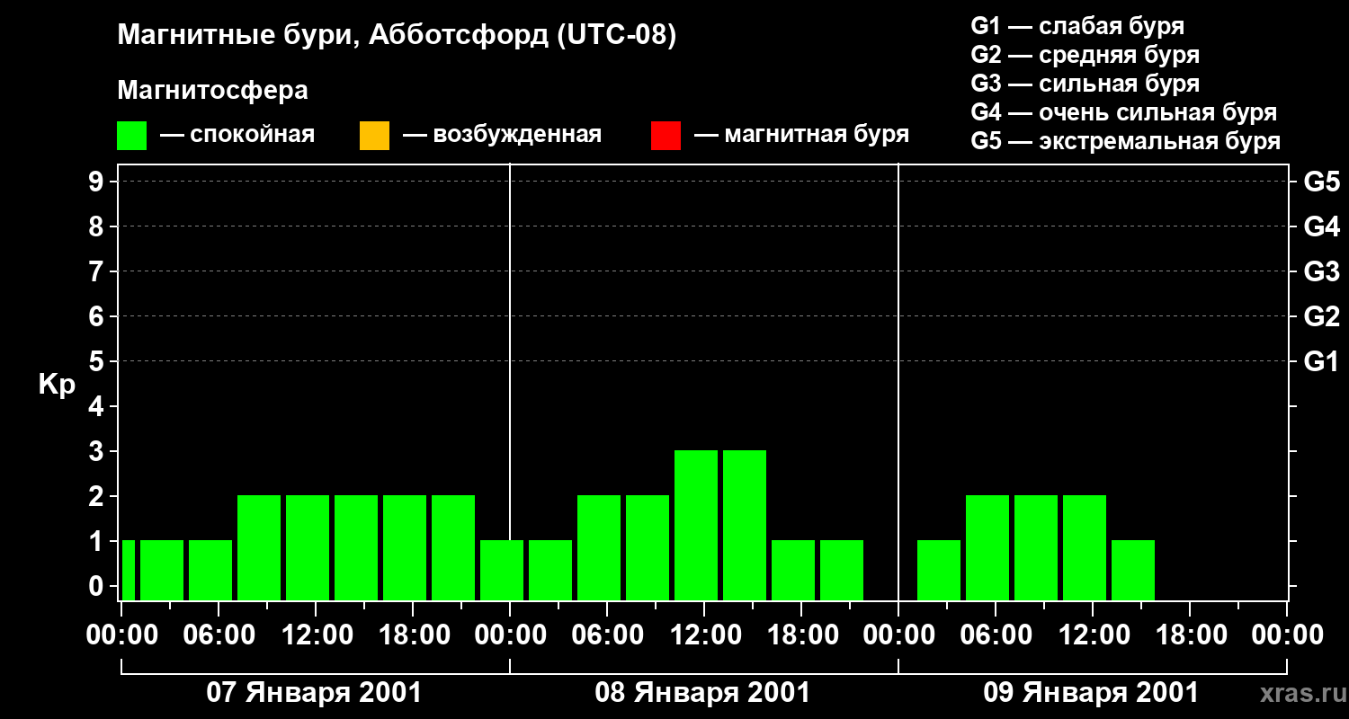 Изменения геомагнитного индекса Kp с 7 по 9 января 2001 года для средних широт