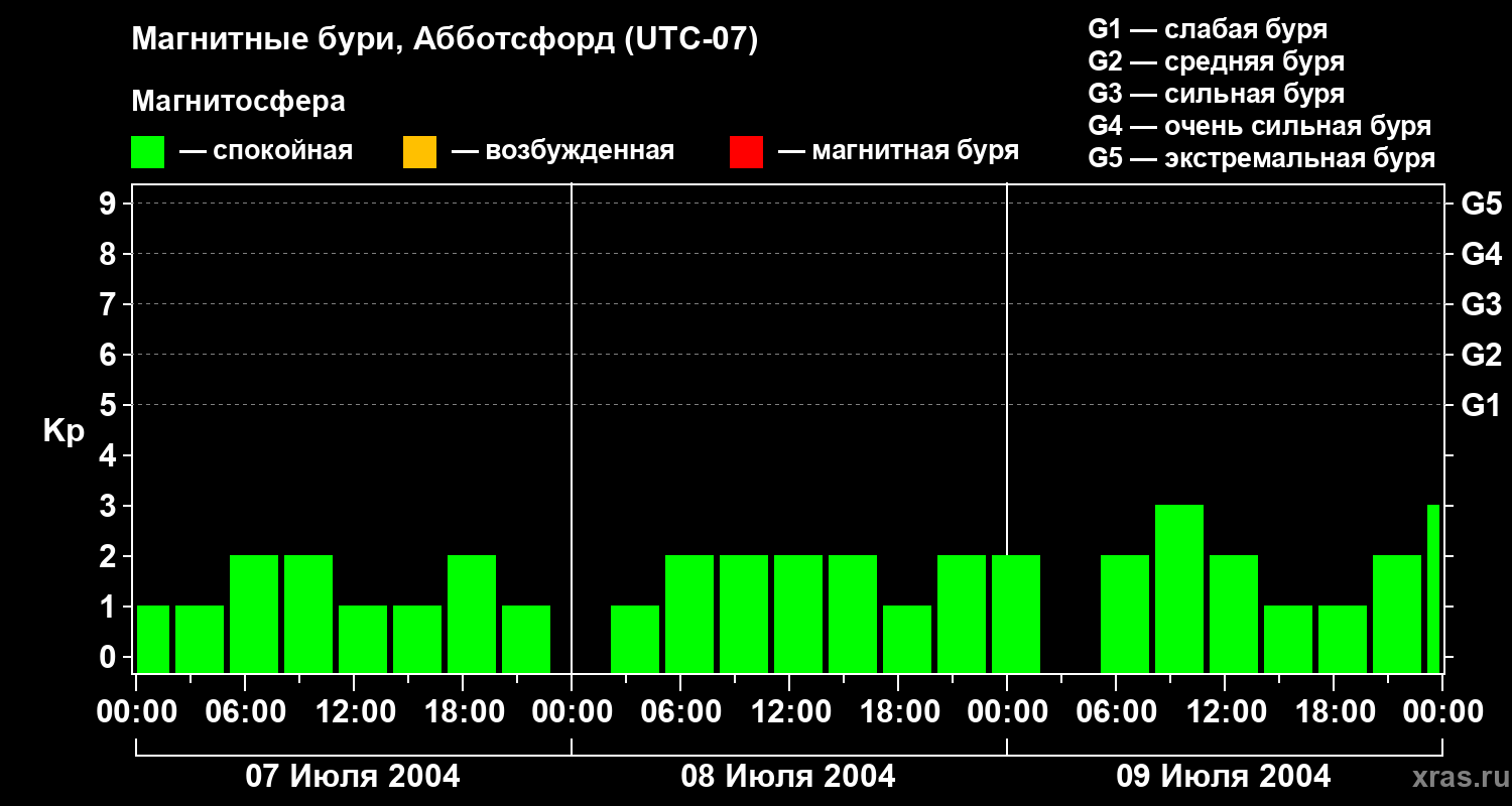 Изменения геомагнитного индекса Kp с 7 по 9 июля 2004 года для средних широт