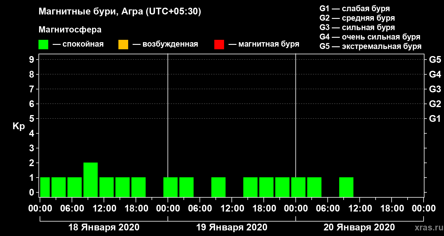 Изменения геомагнитного индекса Kp с 18 по 20 января 2020 года для средних широт