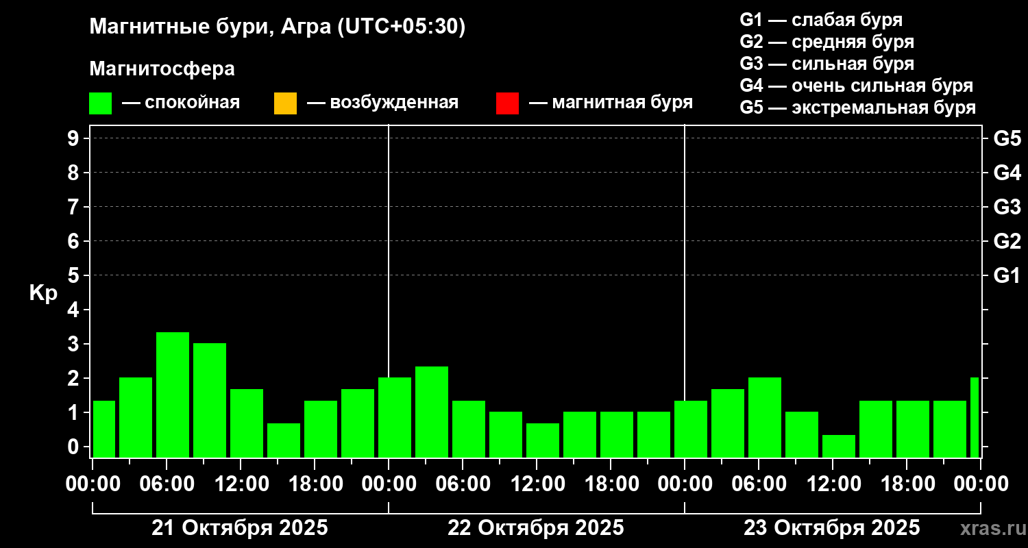 Изменения геомагнитного индекса Kp с 21 по 23 октября 2025 года для средних широт