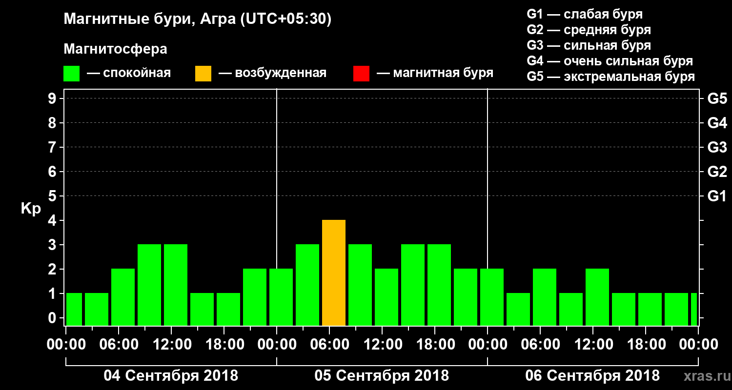 Изменения геомагнитного индекса Kp с 4 по 6 сентября 2018 года для средних широт