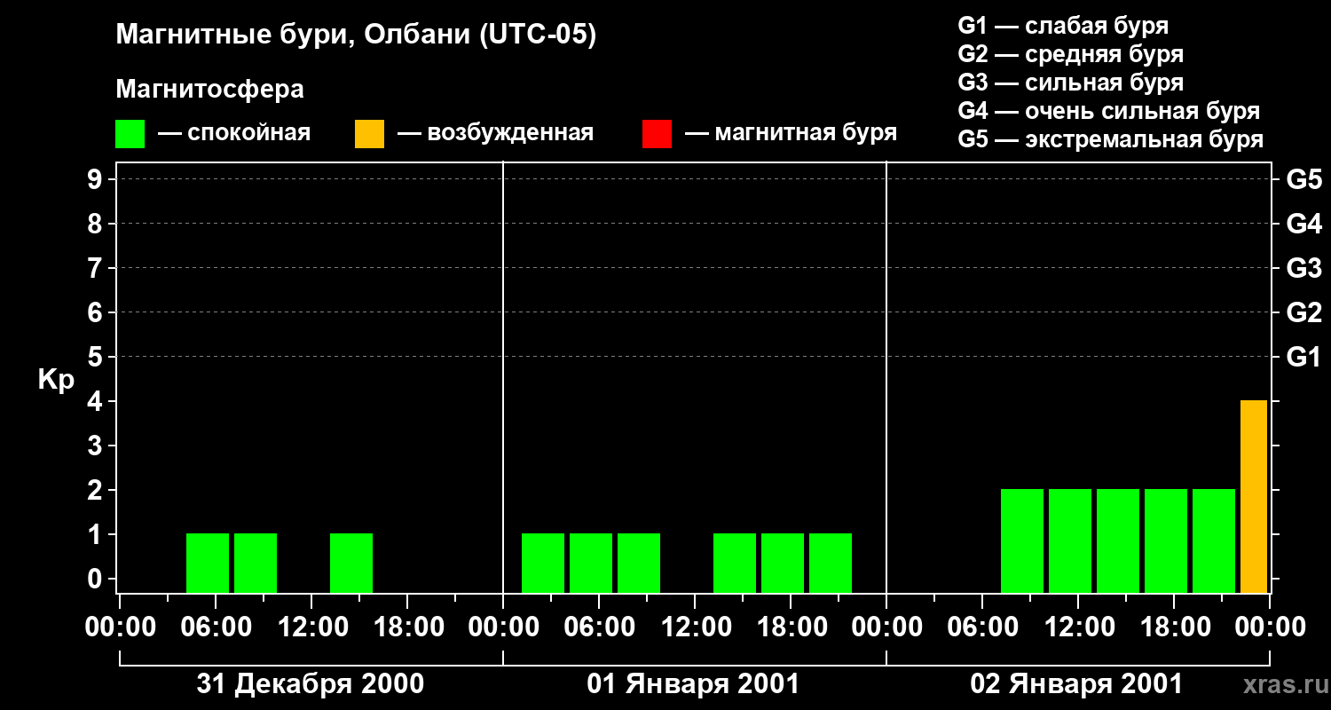 Изменения геомагнитного индекса Kp с 31 декабря 2000 года по 2 января 2001 года для средних широт