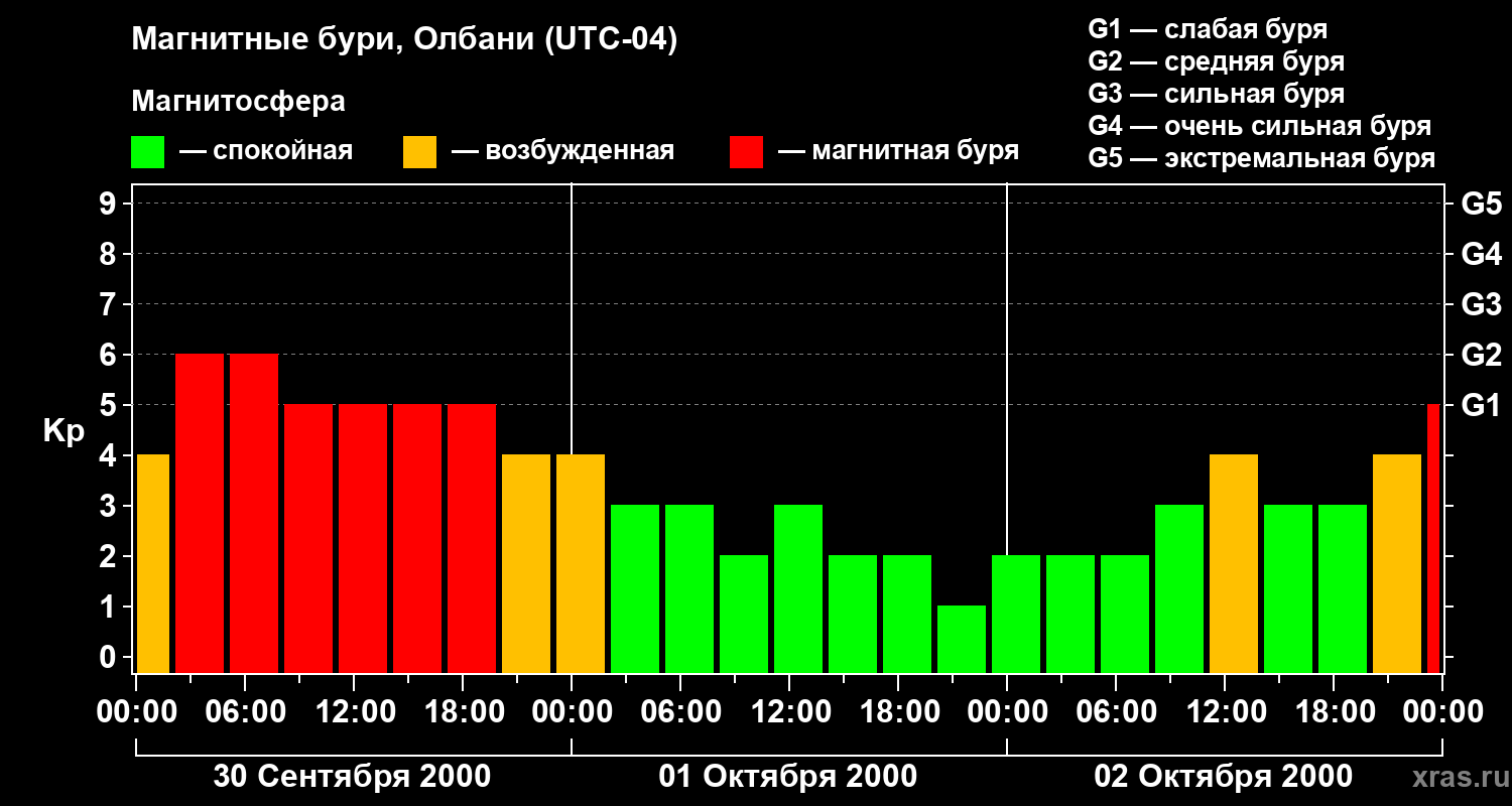 Изменения геомагнитного индекса Kp с 30 сентября по 2 октября 2000 года для средних широт