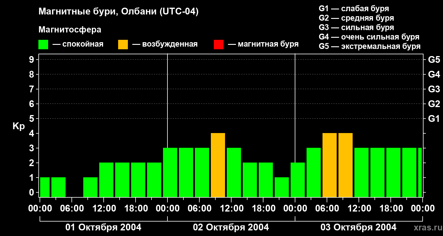 Изменения геомагнитного индекса Kp с 1 по 3 октября 2004 года для средних широт