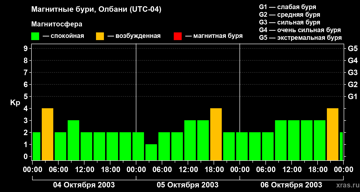 Изменения геомагнитного индекса Kp с 4 по 6 октября 2003 года для средних широт