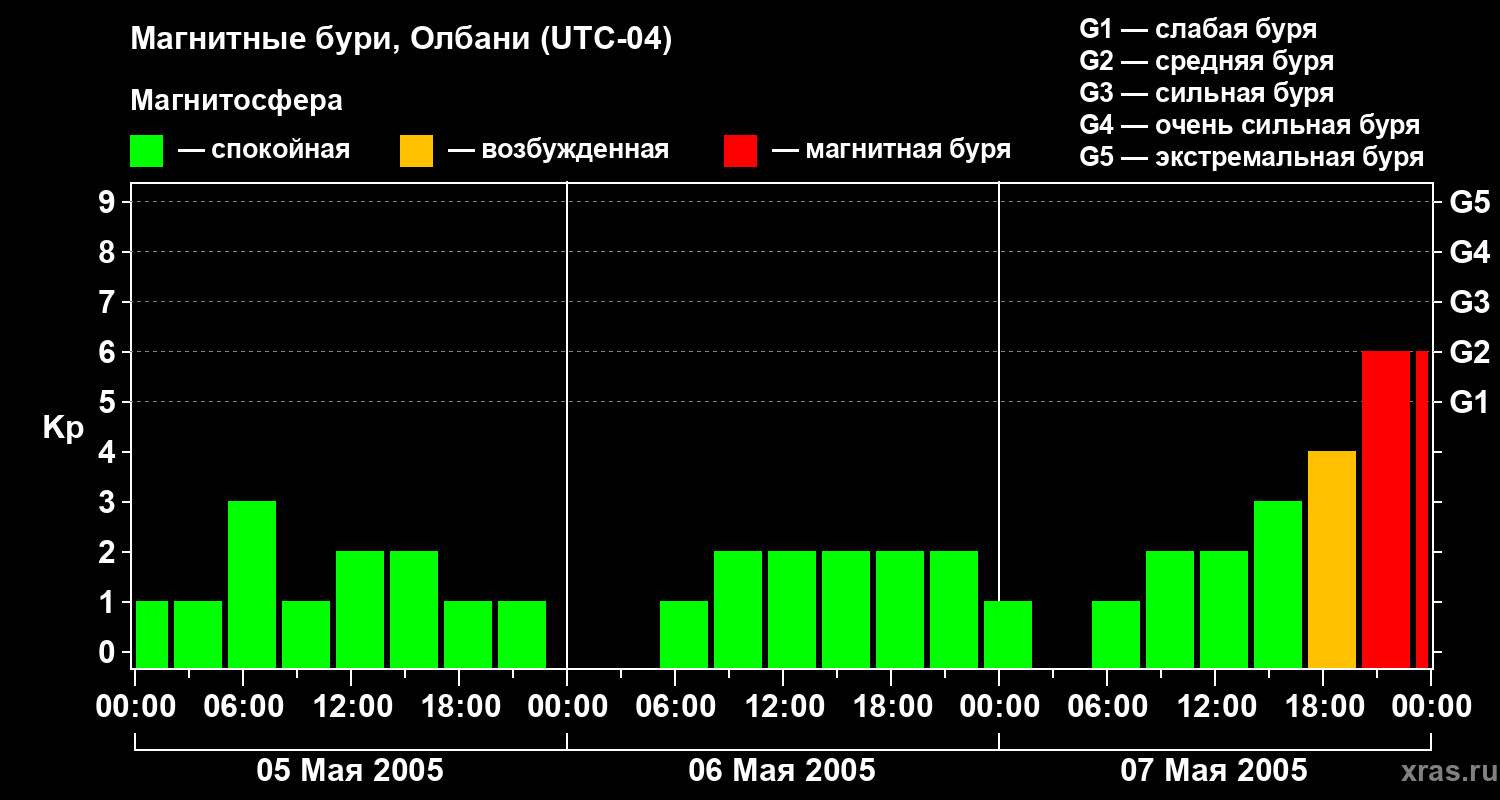 Изменения геомагнитного индекса Kp с 5 по 7 мая 2005 года для средних широт