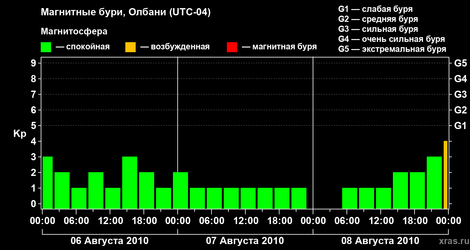 Изменения геомагнитного индекса Kp с 6 по 8 августа 2010 года для средних широт