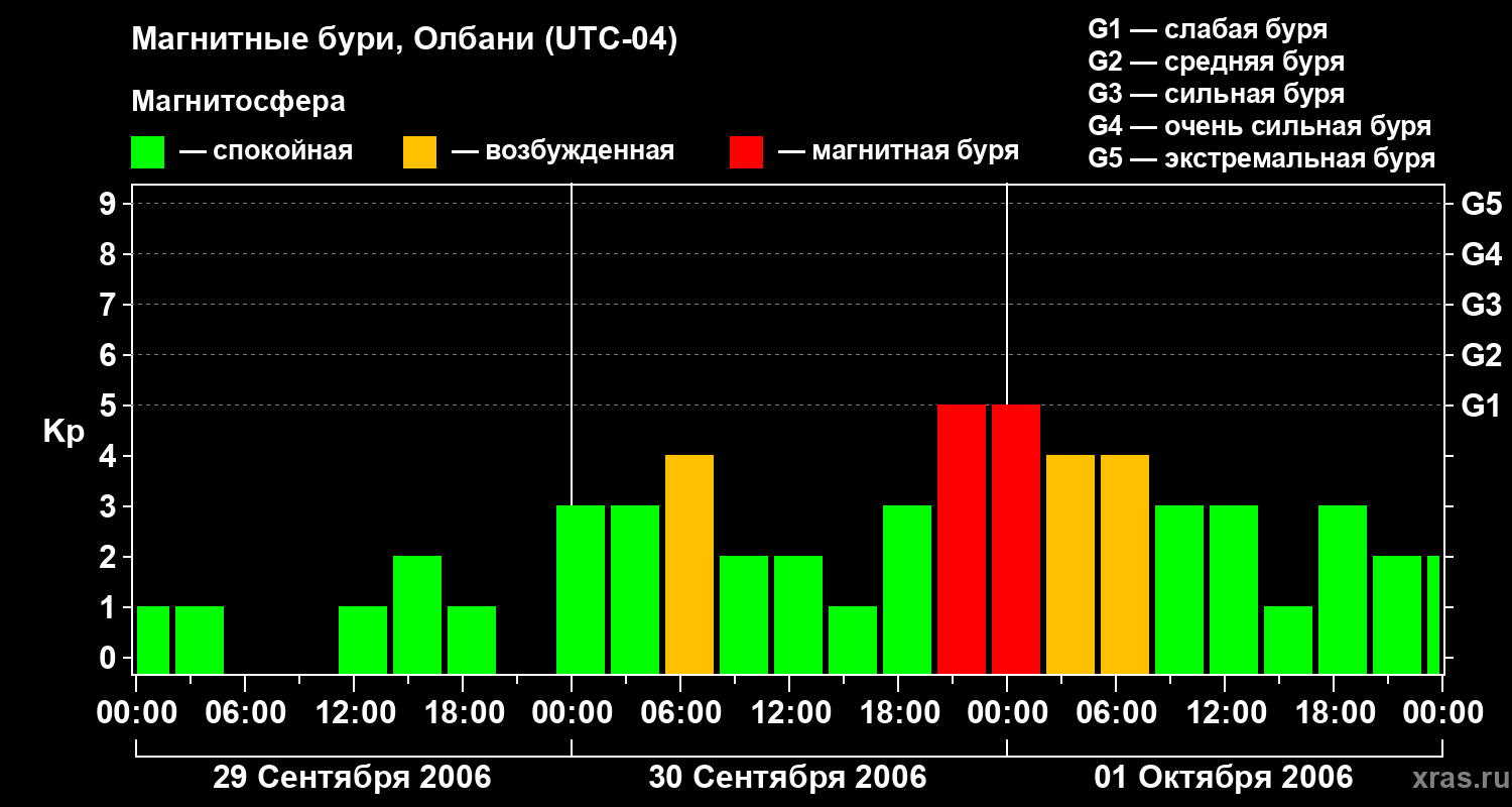 Изменения геомагнитного индекса Kp с 29 сентября по 1 октября 2006 года для средних широт