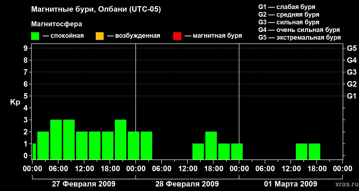 Изменения геомагнитного индекса Kp с 27 февраля по 1 марта 2009 года для средних широт