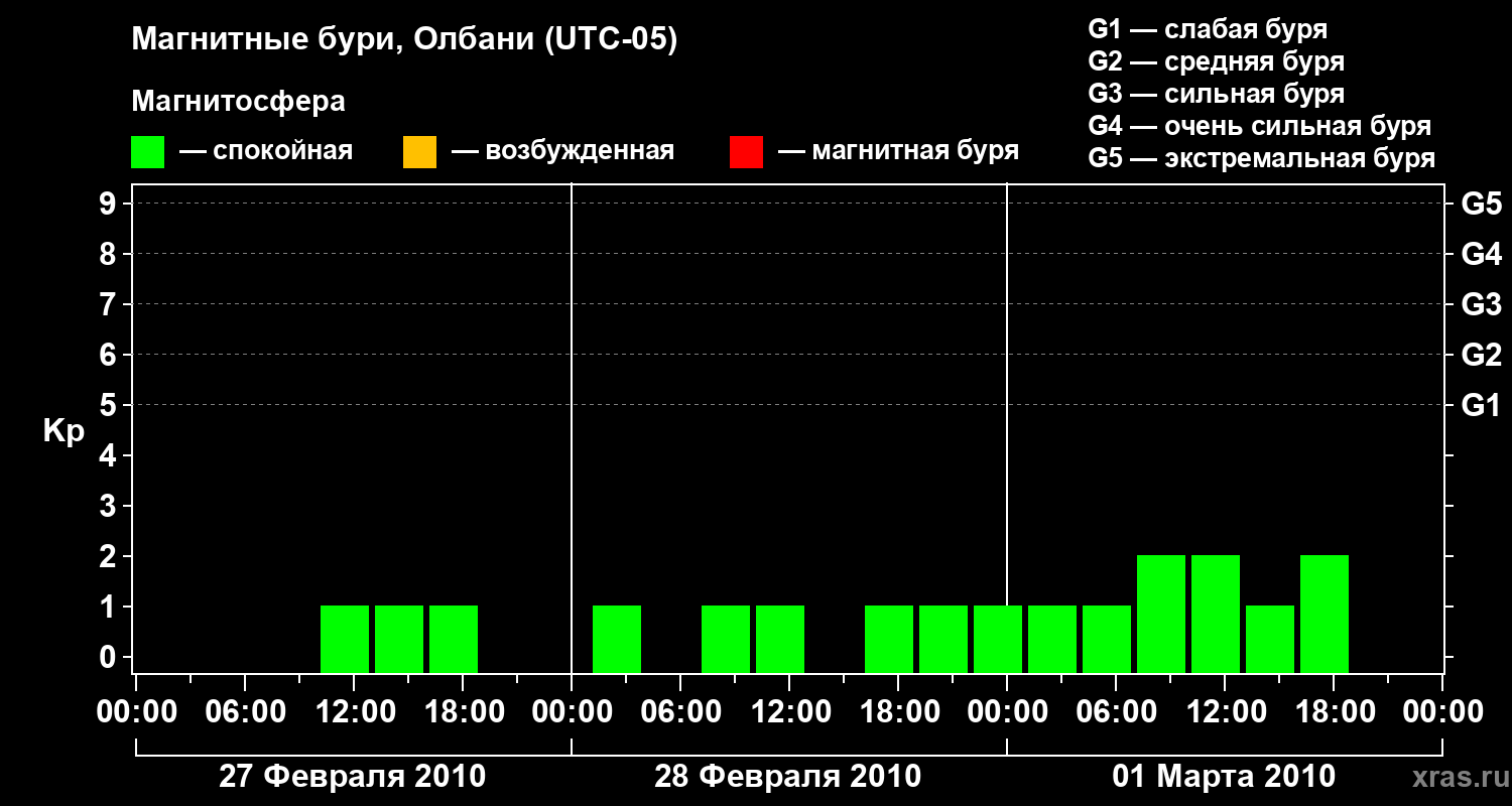 Изменения геомагнитного индекса Kp с 27 февраля по 1 марта 2010 года для средних широт