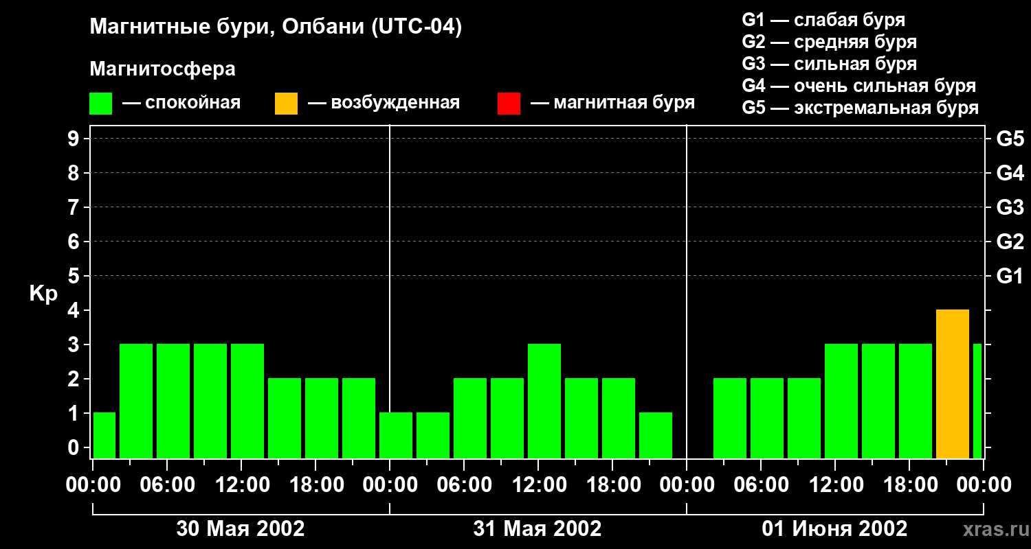 Изменения геомагнитного индекса Kp с 30 мая по 1 июня 2002 года для средних широт