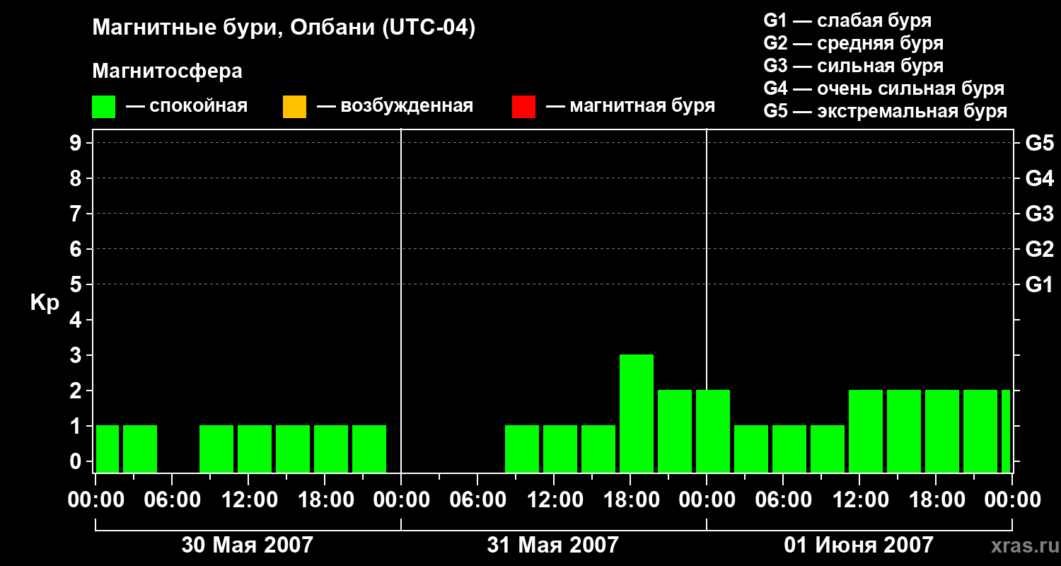 Изменения геомагнитного индекса Kp с 30 мая по 1 июня 2007 года для средних широт