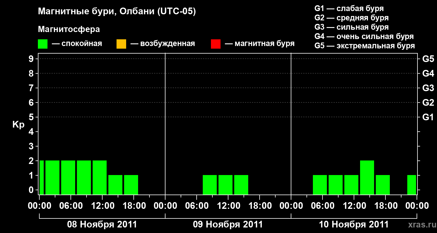 Изменения геомагнитного индекса Kp с 8 по 10 ноября 2011 года для средних широт