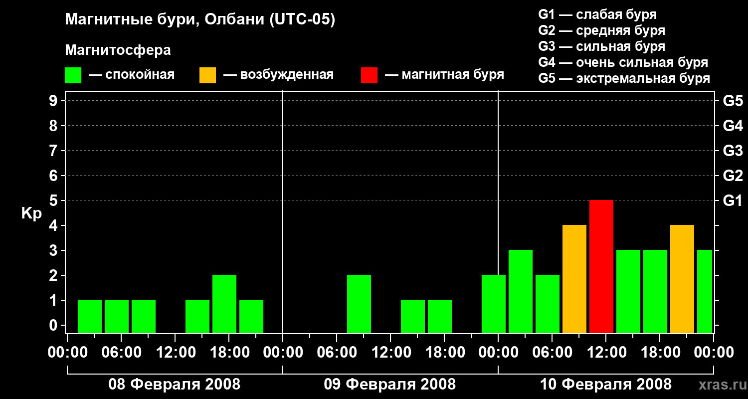 Изменения геомагнитного индекса Kp с 8 по 10 февраля 2008 года для средних широт