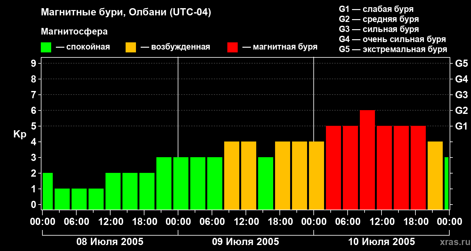 Изменения геомагнитного индекса Kp с 8 по 10 июля 2005 года для средних широт