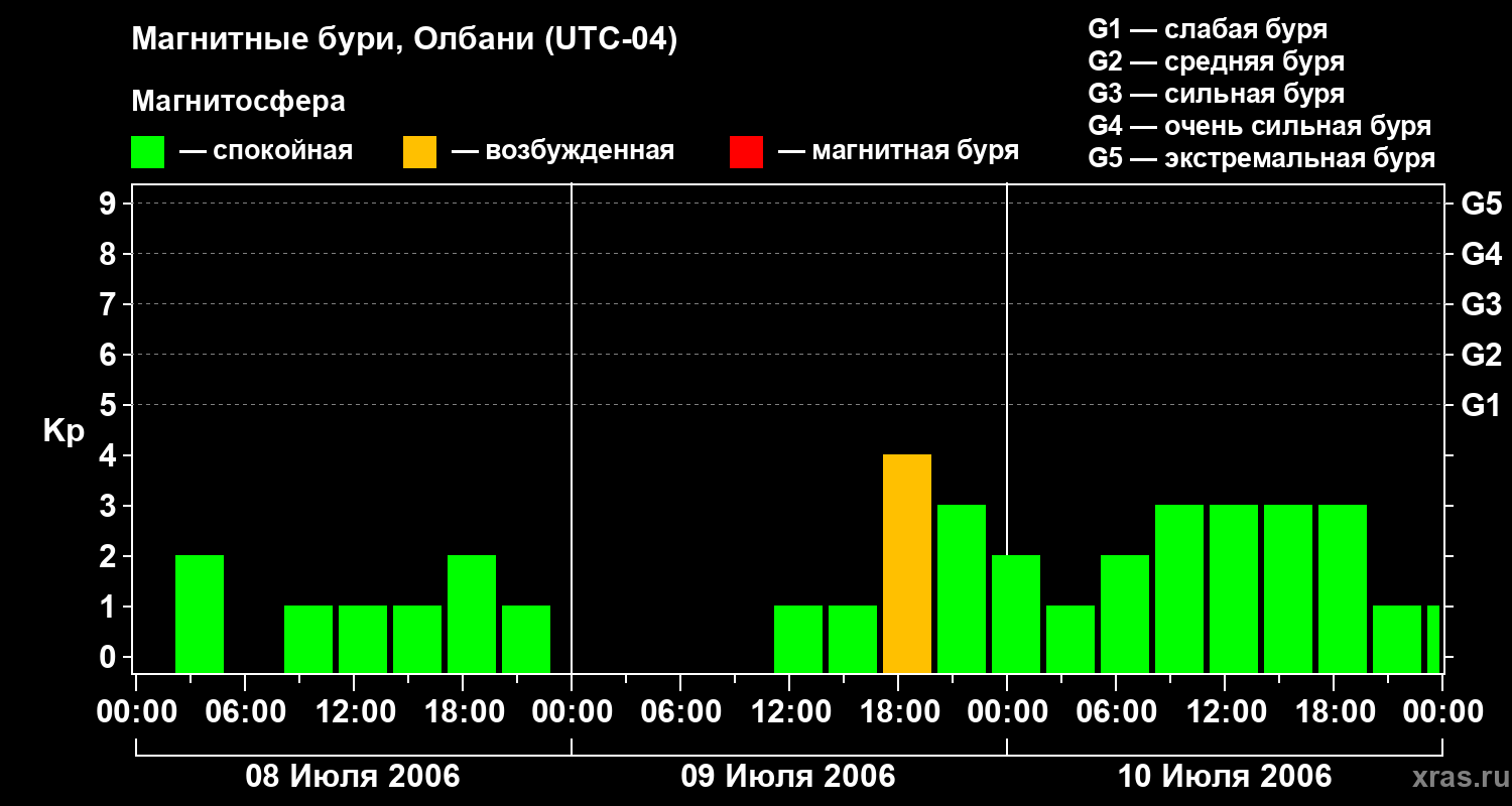 Изменения геомагнитного индекса Kp с 8 по 10 июля 2006 года для средних широт
