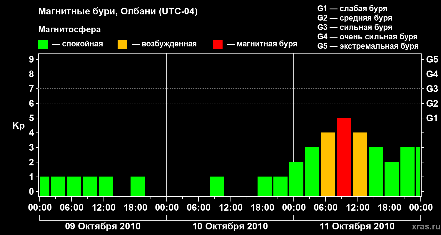 Изменения геомагнитного индекса Kp с 9 по 11 октября 2010 года для средних широт