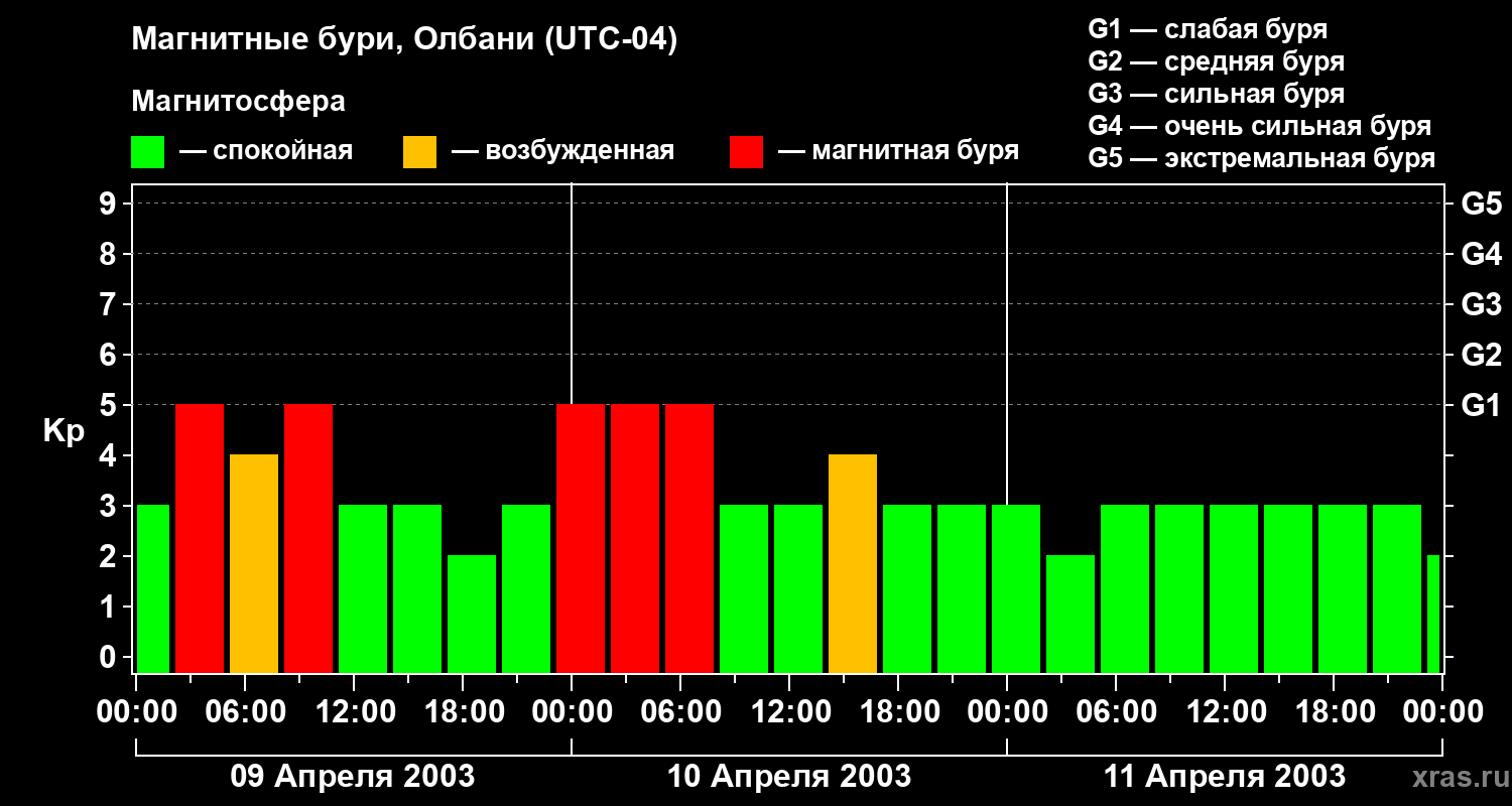 Изменения геомагнитного индекса Kp с 9 по 11 апреля 2003 года для средних широт