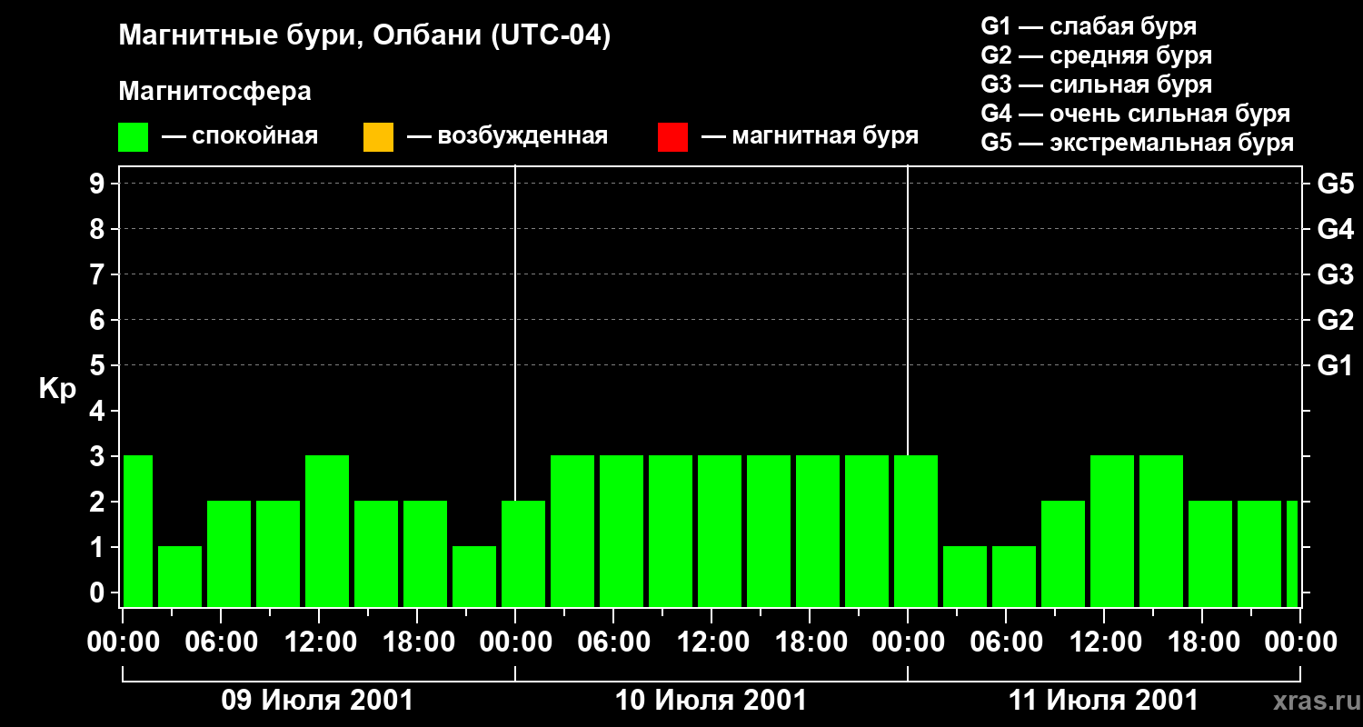 Изменения геомагнитного индекса Kp с 9 по 11 июля 2001 года для средних широт