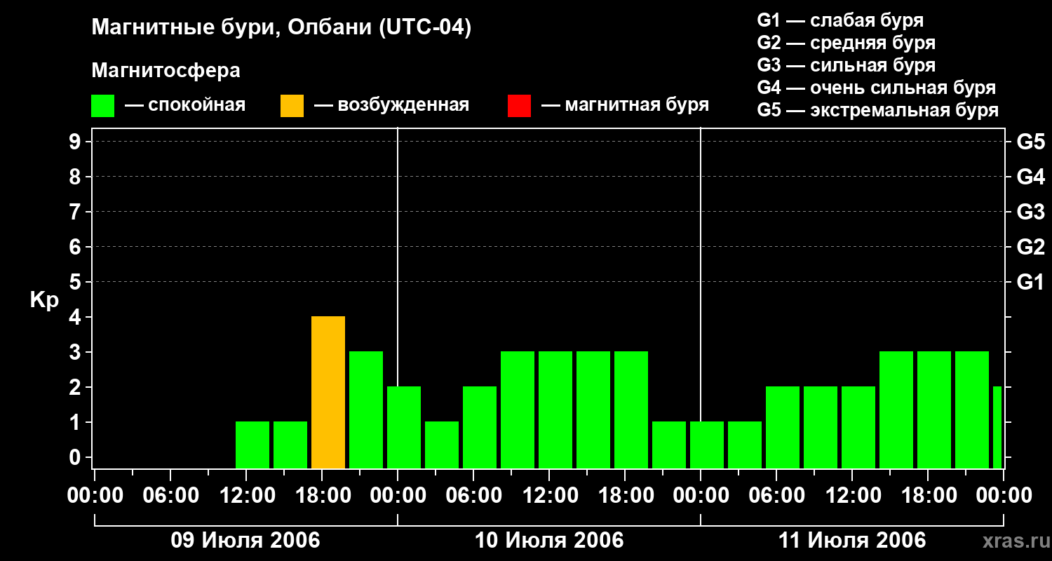 Изменения геомагнитного индекса Kp с 9 по 11 июля 2006 года для средних широт