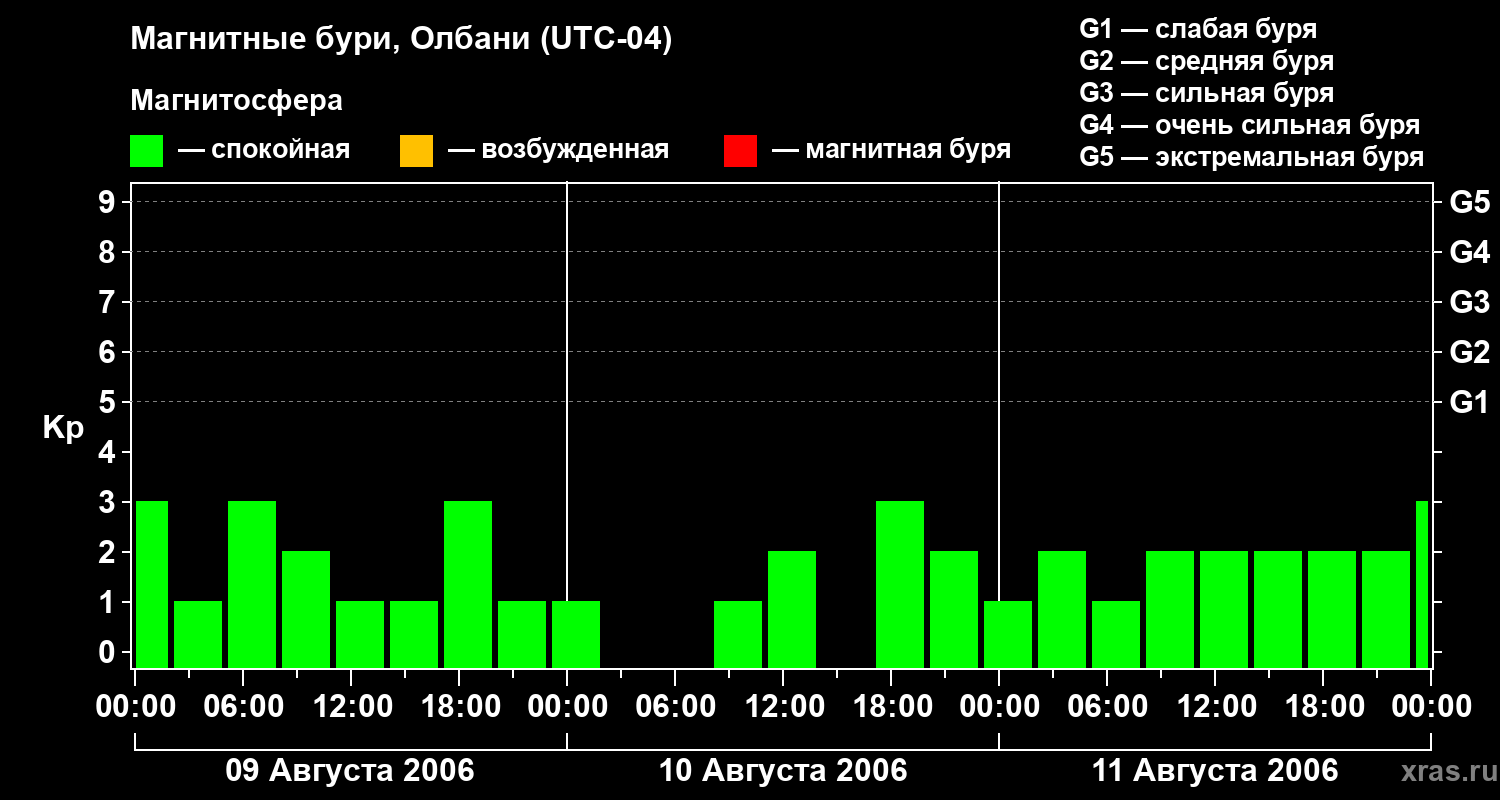 Изменения геомагнитного индекса Kp с 9 по 11 августа 2006 года для средних широт