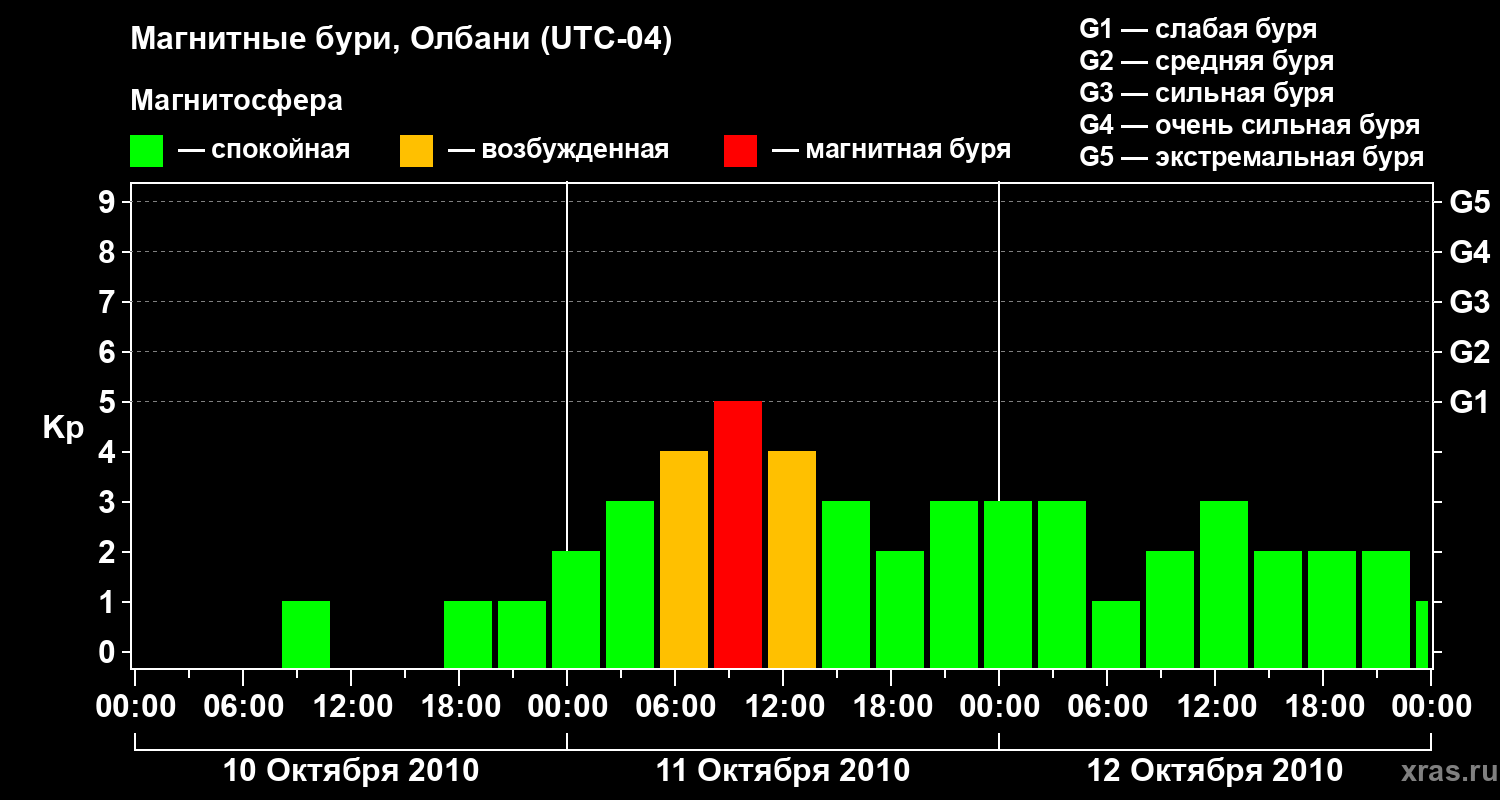 Изменения геомагнитного индекса Kp с 10 по 12 октября 2010 года для средних широт