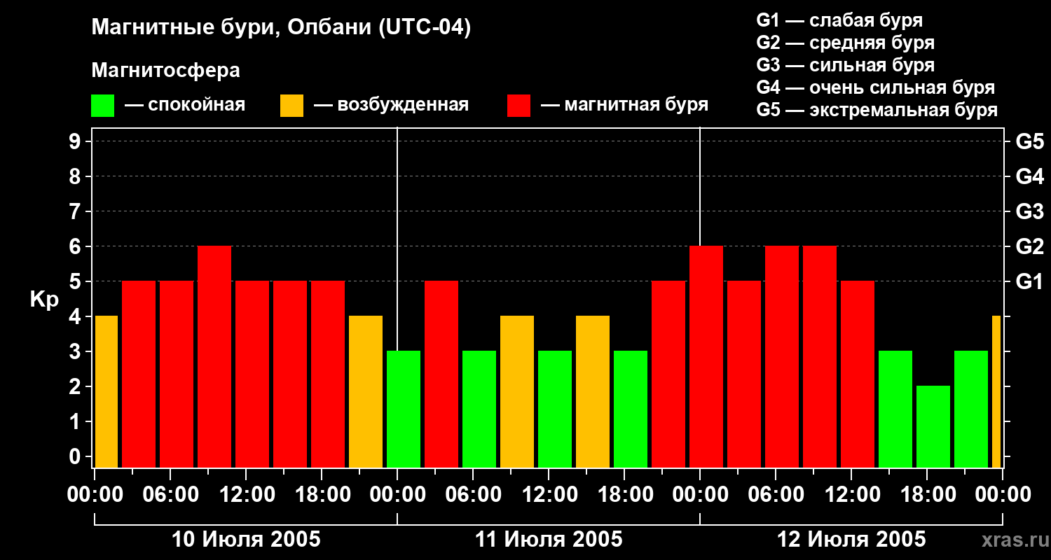 Изменения геомагнитного индекса Kp с 10 по 12 июля 2005 года для средних широт