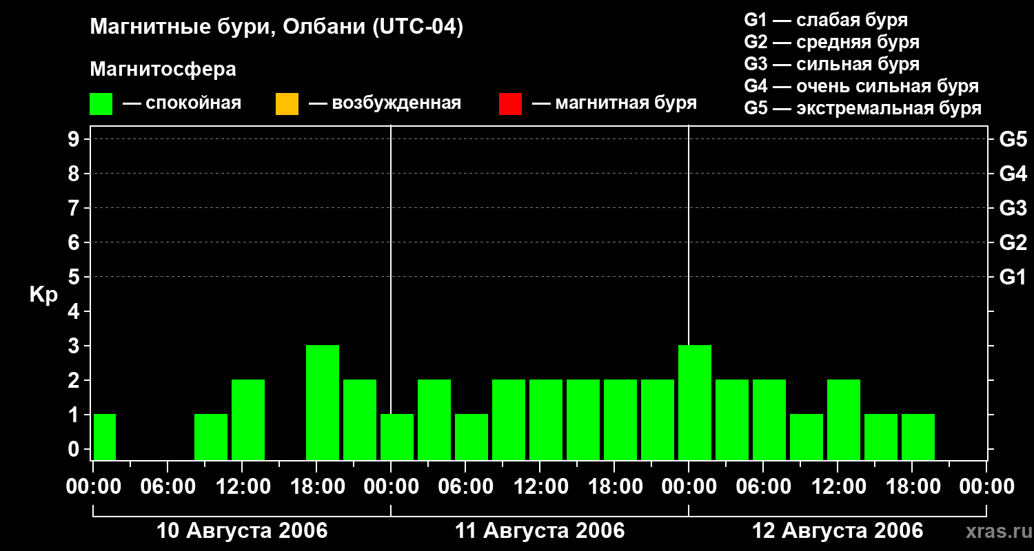 Изменения геомагнитного индекса Kp с 10 по 12 августа 2006 года для средних широт