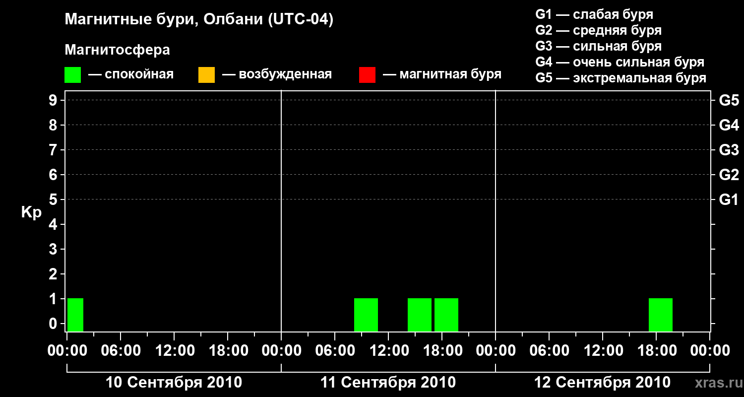 Изменения геомагнитного индекса Kp с 10 по 12 сентября 2010 года для средних широт