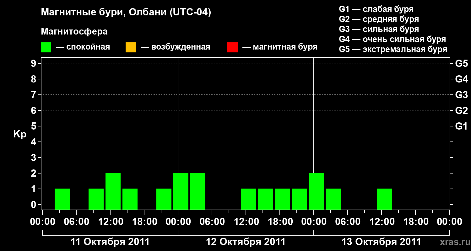 Изменения геомагнитного индекса Kp с 11 по 13 октября 2011 года для средних широт