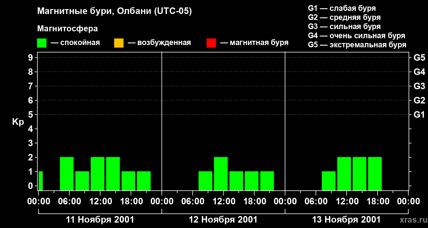Изменения геомагнитного индекса Kp с 11 по 13 ноября 2001 года для средних широт