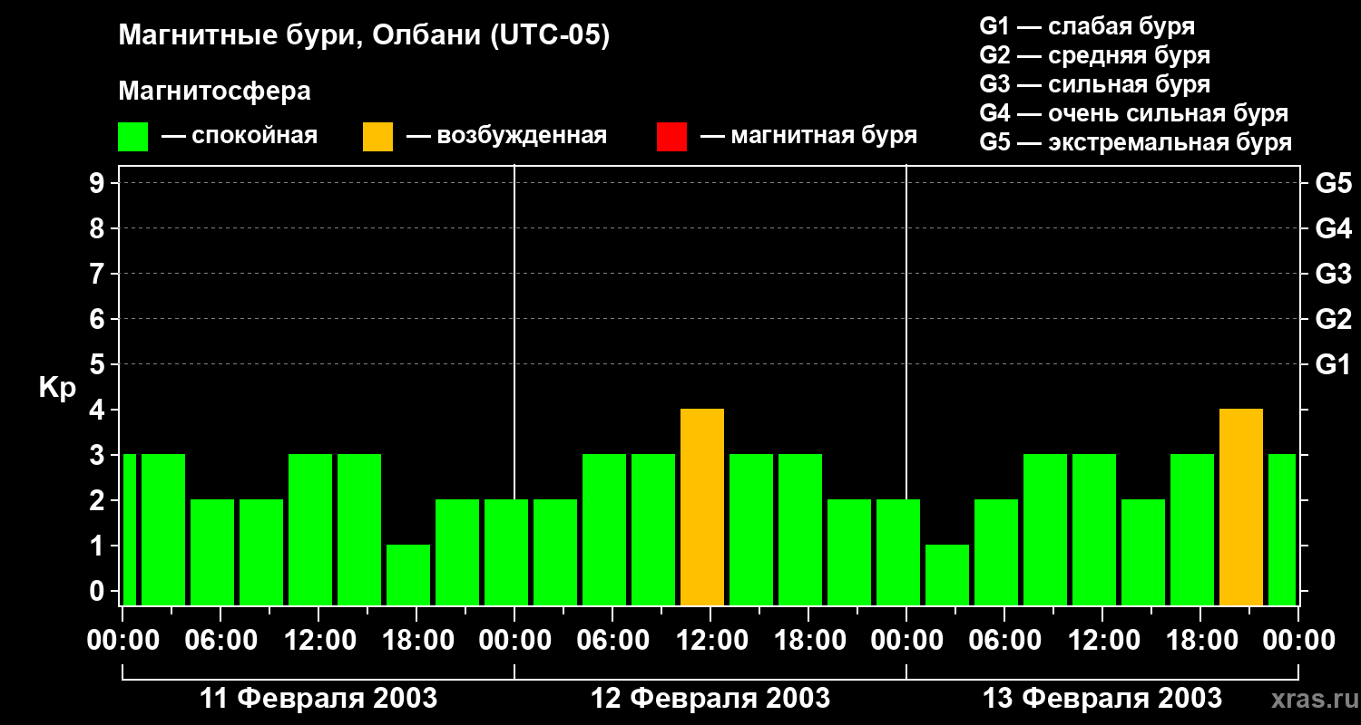 Изменения геомагнитного индекса Kp с 11 по 13 февраля 2003 года для средних широт