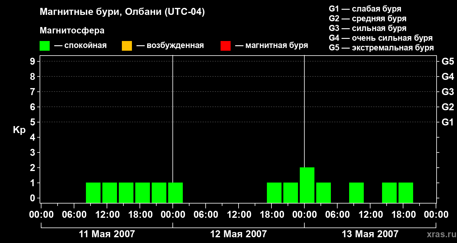 Изменения геомагнитного индекса Kp с 11 по 13 мая 2007 года для средних широт