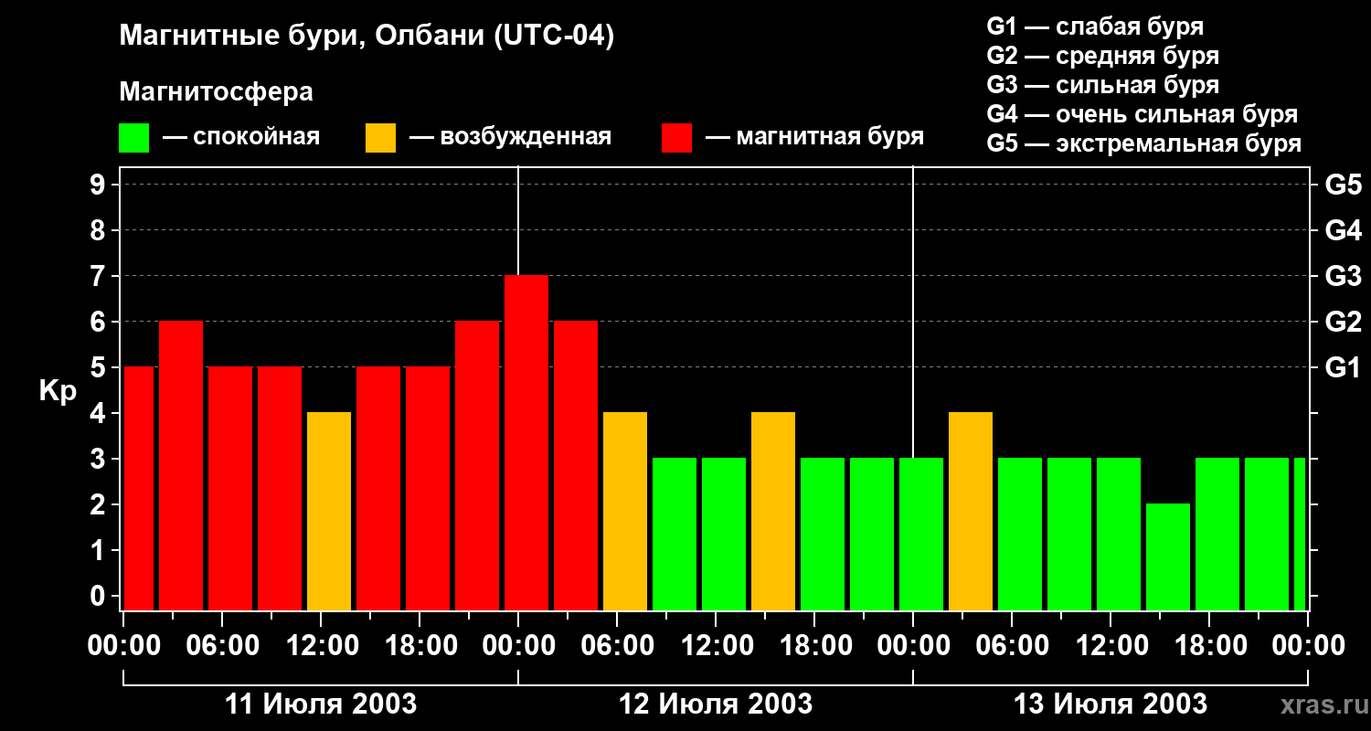 Изменения геомагнитного индекса Kp с 11 по 13 июля 2003 года для средних широт