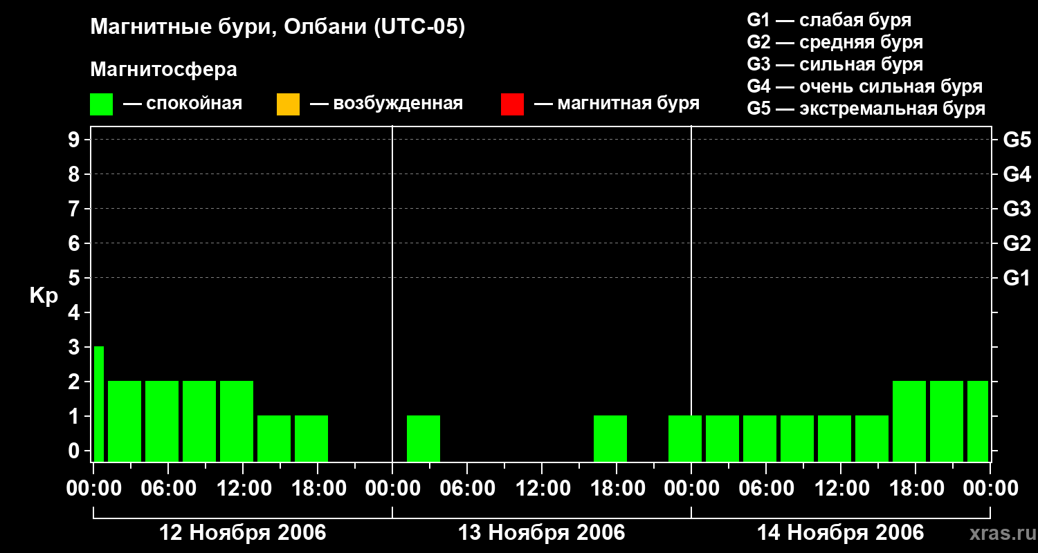 Изменения геомагнитного индекса Kp с 12 по 14 ноября 2006 года для средних широт