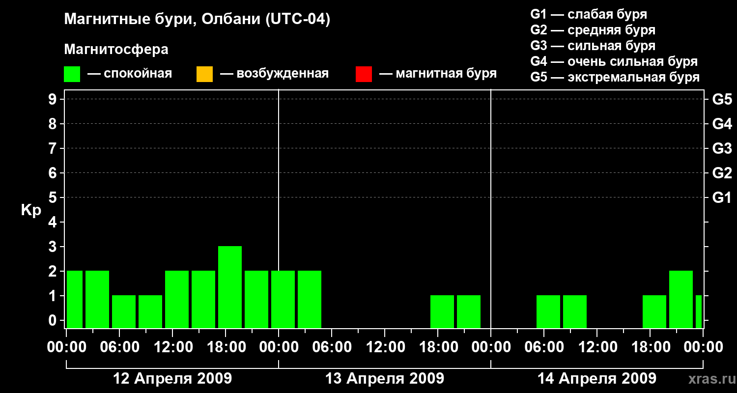 Изменения геомагнитного индекса Kp с 12 по 14 апреля 2009 года для средних широт
