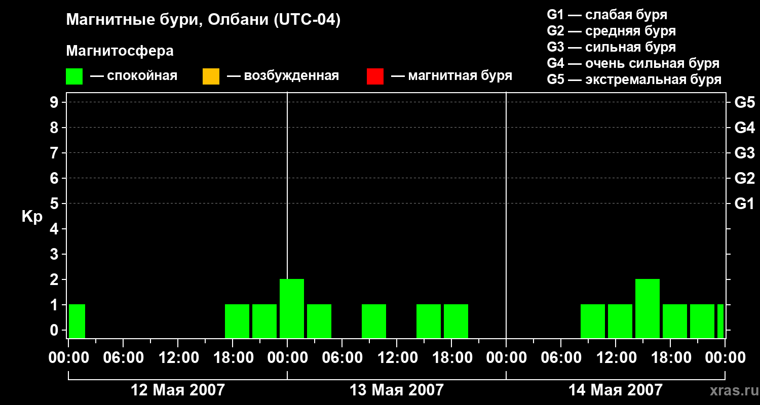 Изменения геомагнитного индекса Kp с 12 по 14 мая 2007 года для средних широт
