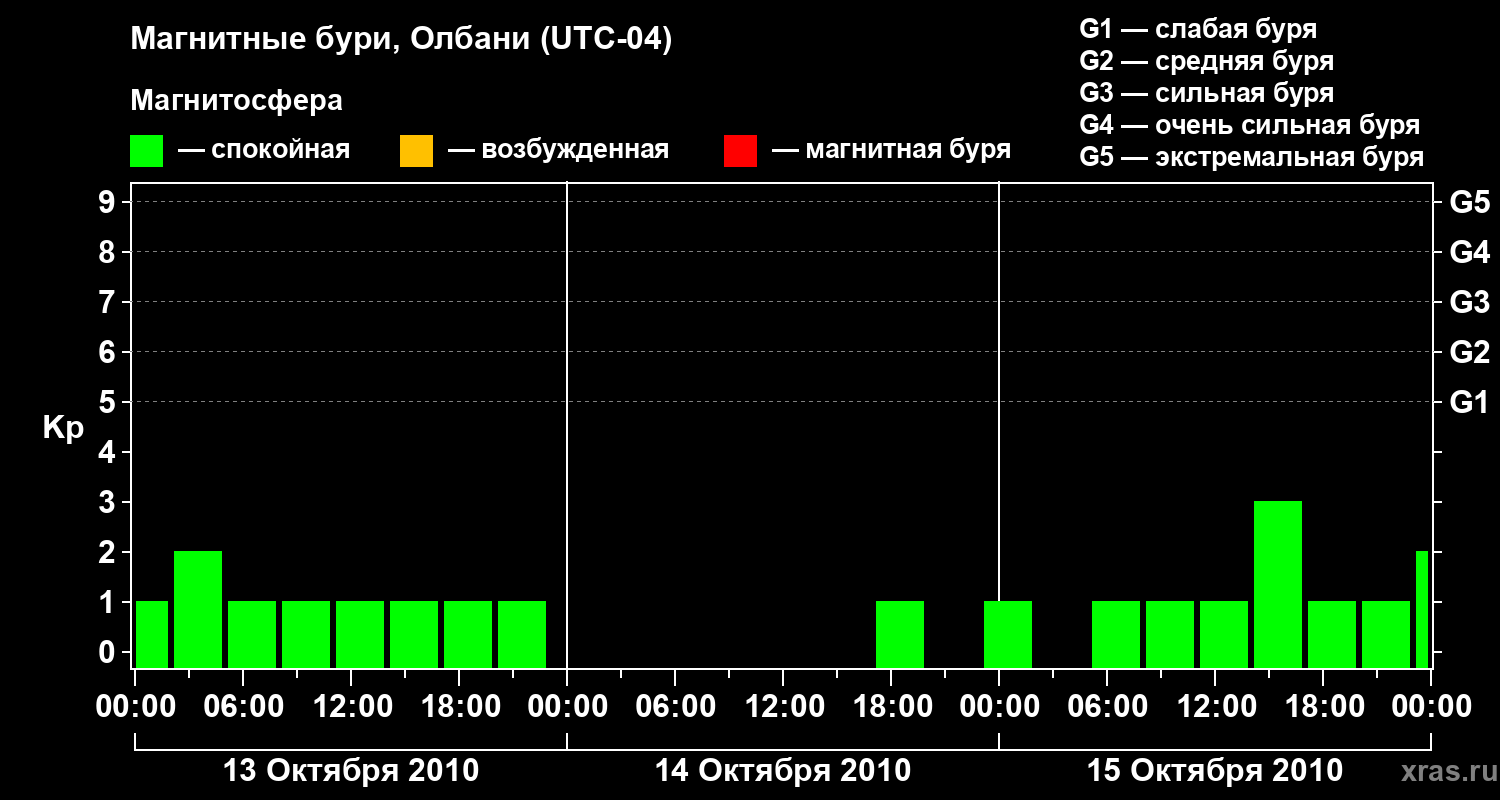 Изменения геомагнитного индекса Kp с 13 по 15 октября 2010 года для средних широт